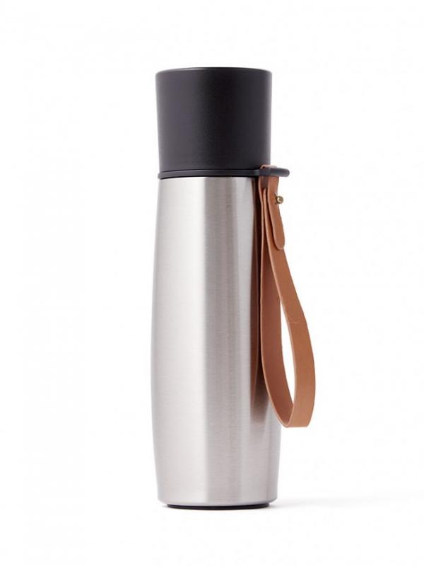 Ståltermos med färgad kork som har en stilfull PU-detalj på locket vilket också fungerar som en praktisk hängare eller handtag. Termosen har två muggar och rymmer 0,5 liter. Flaskan är tillverkad i 18/8 rostfritt stål vilket innebär att den inte tar smak eller doft av tidigare innehåll. Håller vatten iskallt i upp till 18 timmar och varma drycker varma i upp till 6 timmar.