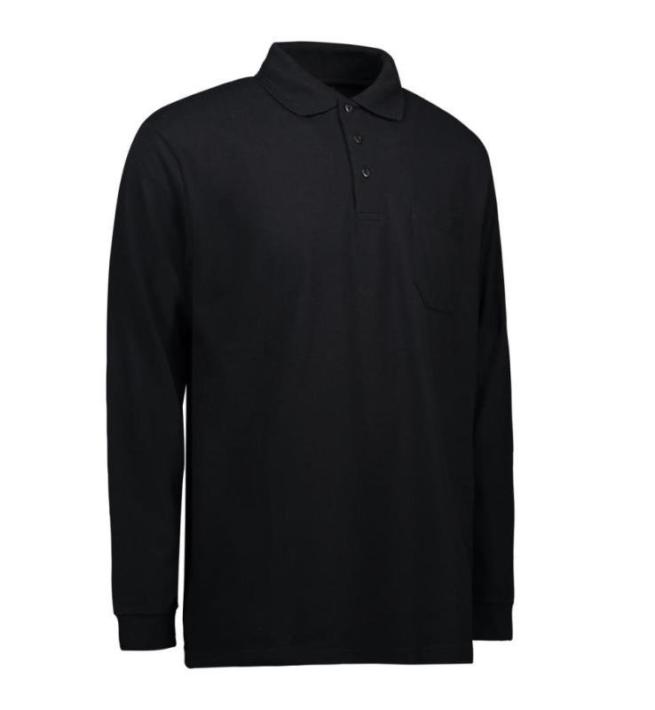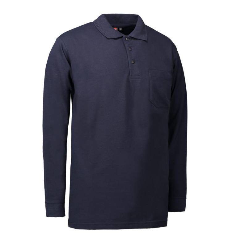 Slitstark pikétröja med långa ärmar och bröstficka. Nack- och axelband och halvmåne i nacken. Pikétröjan har genomgått en förkrympningsprocess vid mycket höga temperaturer, båda före och efter infärgningen, för extra stabilitet och lång livstid.