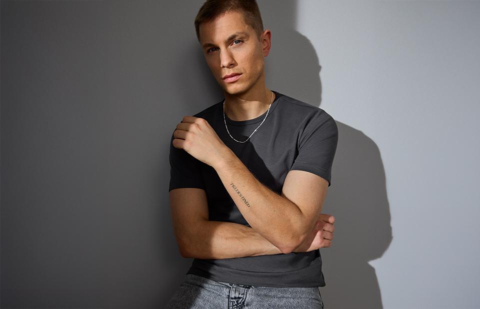 Kortärmad interlock T-shirt i mjuk antipillingkvalitet. Rundringad med smal ribbstickning. Åtsmitande modell.