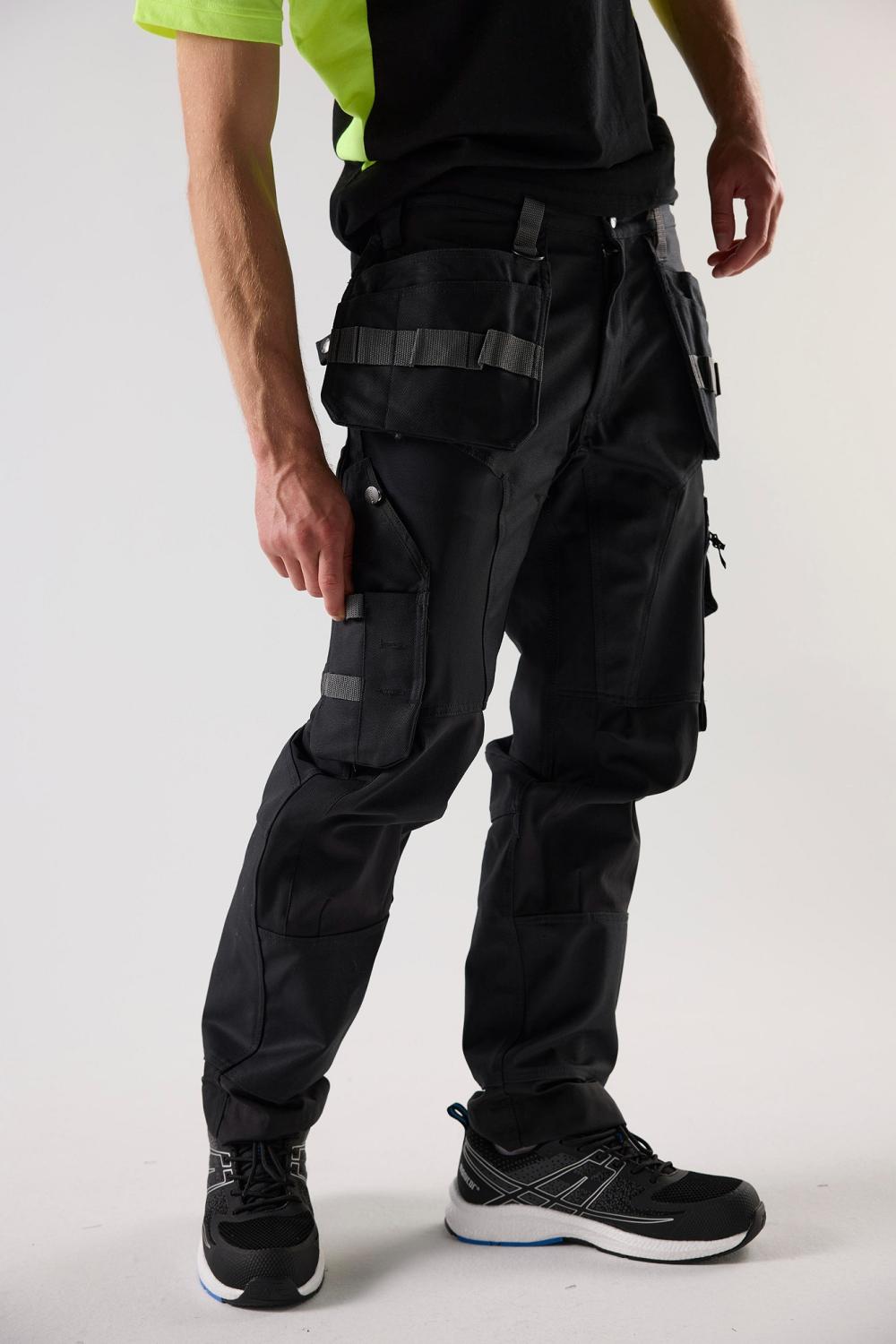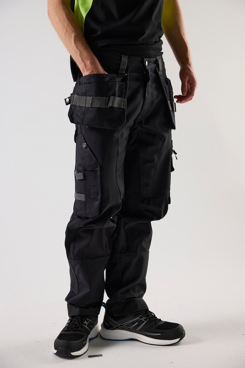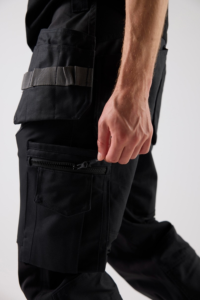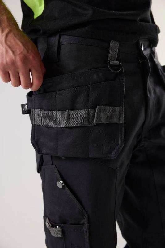 Hantverksbyxa i modern passform med stretchpaneler av CORDURA® med Coolmax®. Coolmax® är en högteknologisk fiber som transporterar bort fukt och ger en behaglig komfort. Stretchpaneler i 4-vägs stretch på noga utvalda ställen för maximal komfort och rörelsefrihet. Panelerna är placerad i gren, lår, över stuss, framsida knä och baksida knä. Byxan har förböjda ben och knäfickor av Cordura®stretch. Knäskydden kan placeras i två nivåer. Två framfickor. Två förstärkta bakfickor med bälg. Löst hängande spikfickor förstärkta med Cordura®. Hängfickorna är utrustade med tre extra fack och verktygshällor. Id-korts ficka. Reglerbar hammarhank. Framflyttad tumstocksficka som är släppt nertill för bättre komfort. Tumstocksfickan är utrustad med två knivhållare, knivhälla och pennficka. Benficka med dragkedja, stor extraficka samt telefonficka. D-ring.