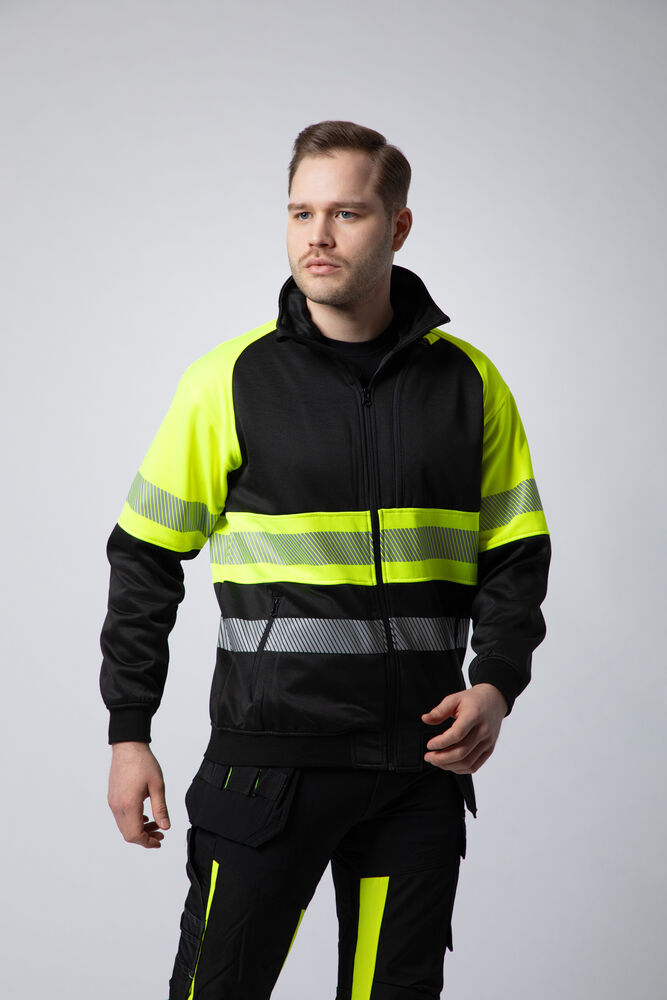 Varseltröja med helt blixtlås ända upp i kragen och blixtlåsförsedda sidfickor. Skurna reflexer för hög flexibilitet och andningsförmåga. Mudd i ärmslut och nederkant. Hög krage för bästa komfort.