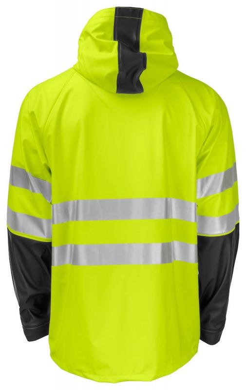 Regnjacka med sydda och svetsade sömmar. Tryckknappar framtill. Reglerbara ärmslut med tryckknappar. Sidfickor med lock. Reglerbar och avtagbar huva.