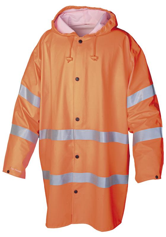 Varselregnrock 100 cm i smidigt stretchmaterial. Blixtlås med slå och tryckknappar. Huva med snodd. Svetsade sömmar. Reglerbart ärmslut. EN 471 klass 3.