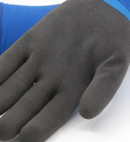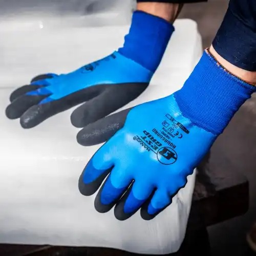 Stickad vattentät vinterhandske i nylon med överlägsen passform och extremt hög komfort. Med ett varmt och mjukt akrylfoder som är borstat för att öka värmeisoleringen och bevara kroppsvärmen bättre. Trippla lager latexbeläggning gör handsken vattentät och ger ytterligare värmeisolering. Butadienfri. Yttersta lagret i Sandy Grip teknologi som ger ett fantastiskt bra grepp i såväl torra som våta och oljiga förhållande. Extremt lätt handske, vilket gör den lämplig för alla våta arbetsmiljöer med låga temperaturer och höga krav på ett säkert grepp.