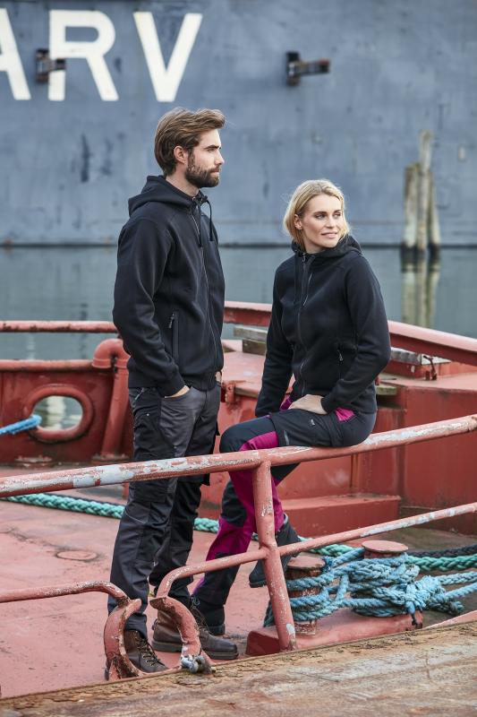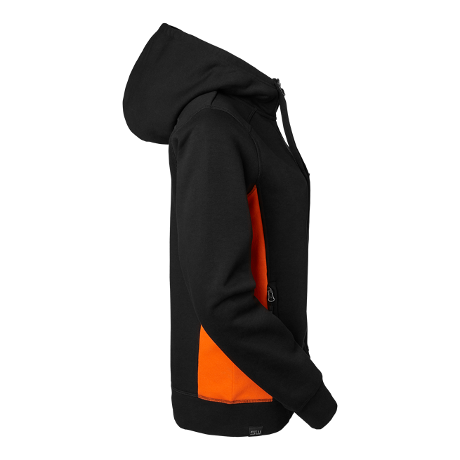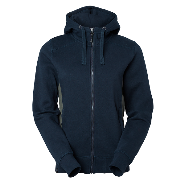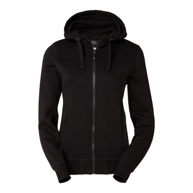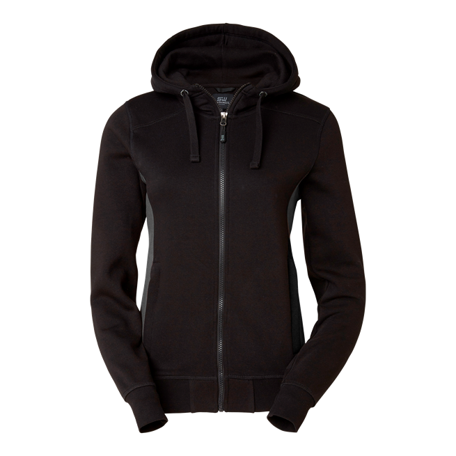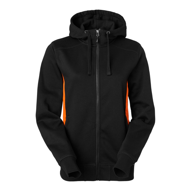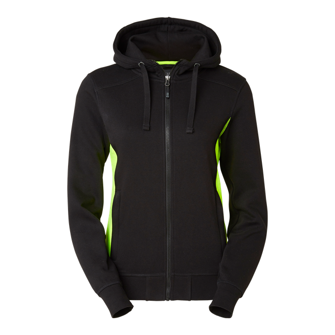 Hoodjacka i dampassform med borstad insida och avvikande paneler i sidan. Två rymliga frontfickor med dragkedja. Jackan har huva med hög hals med dragsko för enkel justering av passform. Elastisk mudd i nederkant och vid ärmslut. Ett färgalternativ med förhöjd synbarhet finns, även ett enfärgat svart.