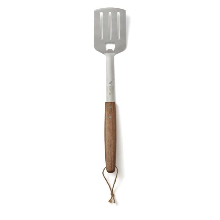 Den generösa längden på 46 cm gör det enkelt att vända allt från stora köttbitar till ömtåliga ingredienser, samtidigt som du håller ett säkert avstånd från hettan. Den slitstarka konstruktionen i rostfritt stål är skapad för att klara hög värme och tuff användning. Handtaget, tillverkat av FSC-märkt akaciaträ, erbjuder inte bara en naturlig elegant finish utan är också ett hållbart val som stödjer ansvarsfullt skogsbruk. Som en extra finess har spaden en inbyggd kapsylöppnare perfekt för att enkelt öppna din favoritdryck direkt vid grillen. Med denna grillspade kombineras funktionalitet och stil i ett verktyg som gör grillningen både smidig och rolig. Ett självklart val för nästa grillfest!