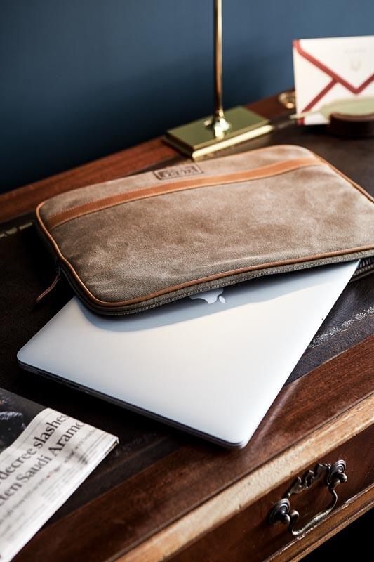 Datorfodral i stentvättad canvas med detaljer i skinnimitation. Fodralet är uppdelat i två olika fack: ett vadderat för datorn samt ett som har plats för andra tillhörigheter. Passar upp till 15 tums bärbar dator.