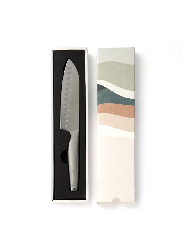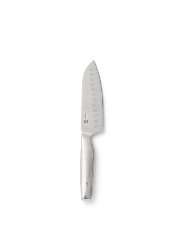 Kniv av hög kvalitet i japanskt stål (420 J2). Santoku är en mycket mångsidig japansk kniv och liknar därför en traditionell kockkniv. Skillnaden är att santoku-kniven har ett kortare blad, vilket gör den snabbare att skära med och bekvämare för knogarna att vila på. Kniven används av många som en allroundkniv eftersom den är mindre och mera praktisk.