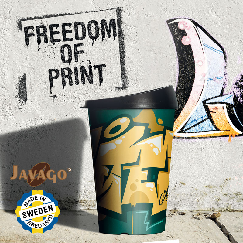 Vår egenproducerade take away mugg JavaGo är den perfekta muggen för den som gillar att dricka sitt kaffe ”on the go”. Tillverkas i Sverige och finns i flera olika färger och tryckmöjligheterna är många.