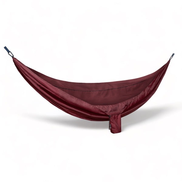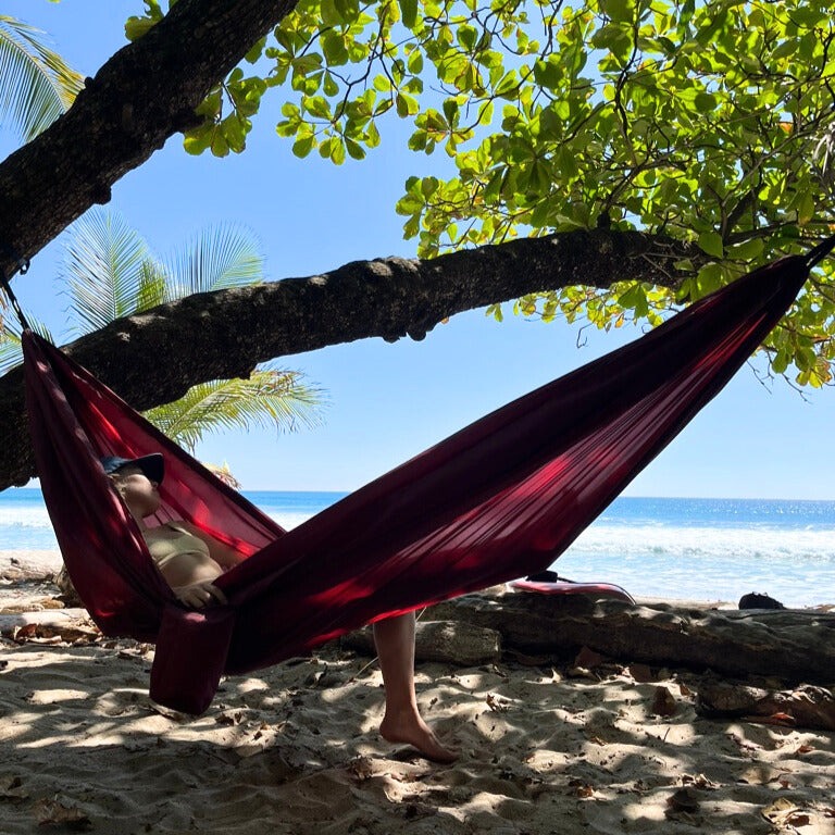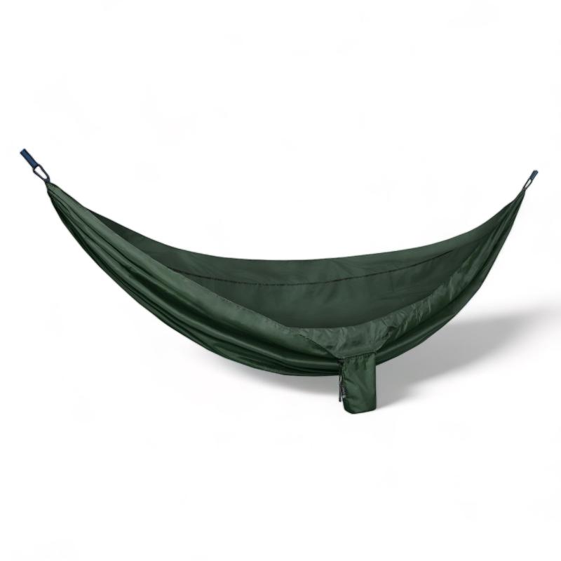 Vår hängmatta vecklas enkelt ut från en liten påse och hängs upp till en fullstor hängmatta med plats för två liggande eller 2-3 sittandes (150kg). Eftersom materialet är slitstarkt men light weight packas hängmattan enkelt ihop till en liten påse som är smidig att ha med sig på resan, utflykten, stranden eller på fjället.