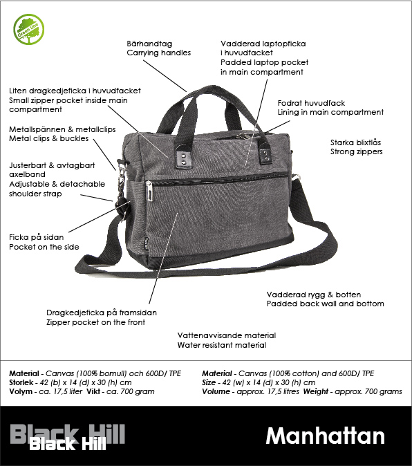Axel-och laptopväska Manhattan från Black Hill är en snygg och välarbetad väska i kraftigt och slitstark bomullscanvas. Den är mjuk,följsam och har en stilren, lyxig look. Väskan har helfodrat huvudfack med vadderad laptopficka, dragkedjeficka fram och liten dragkedjeficka i huvudfacket. Den har även bärhandtag och avtagbart, justerbart axelband så du kan bära väskan som du vill. Manhattan är kvalitet rakt igenom!