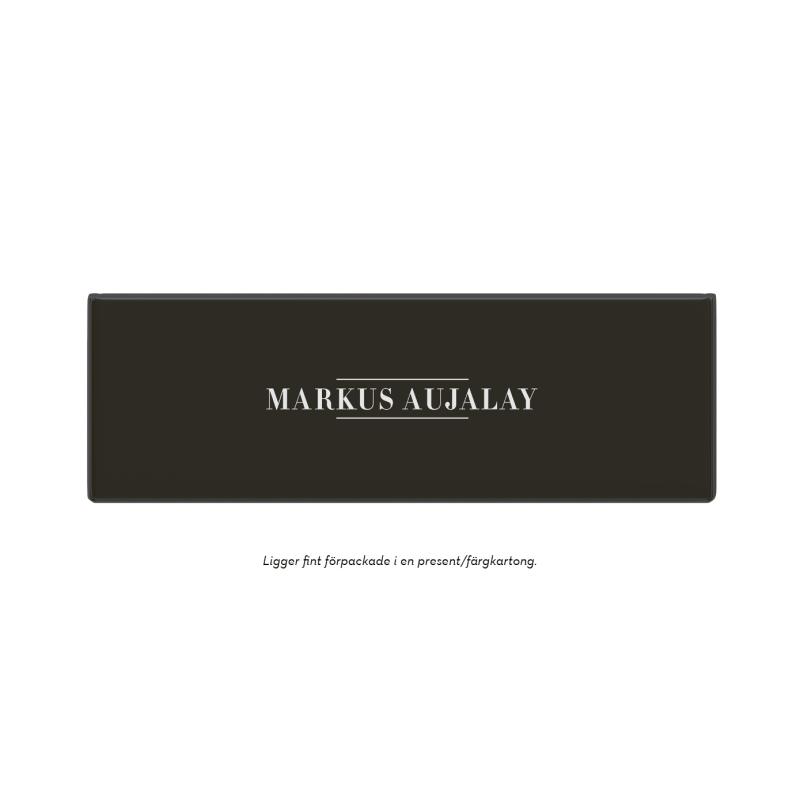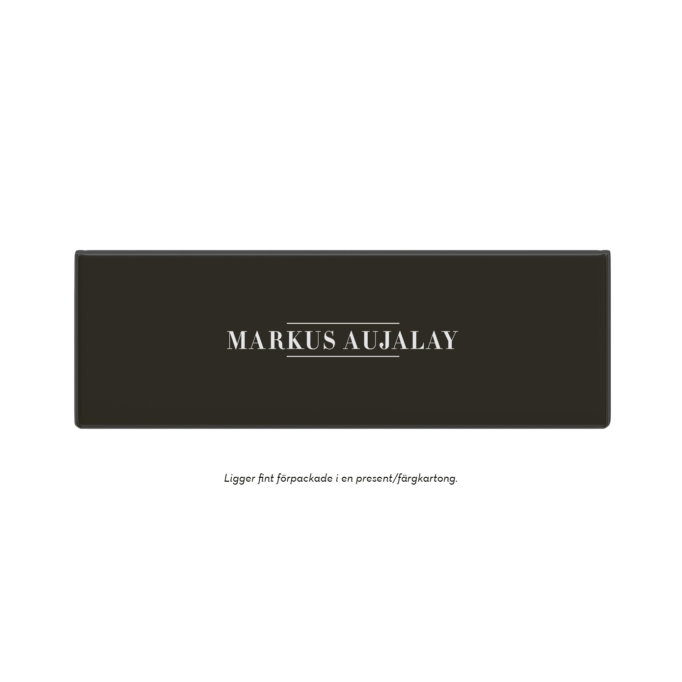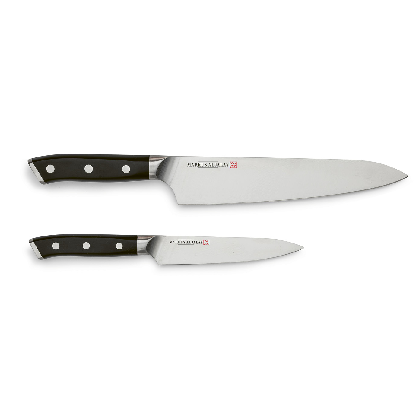 Svarta greppvänliga handtag och Markus Aujalays logo / tecken snyggt etsad / tryckt på bladet.