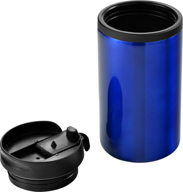 Termosmugg i dubbelväggskonstruktion med skruvlock och dricköppning med snäpplock.