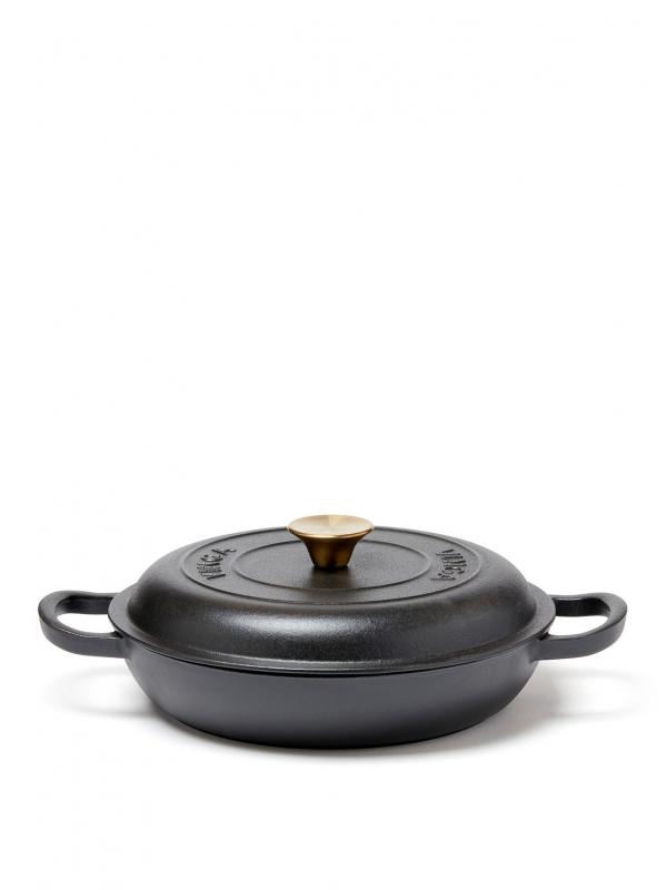 En gjutjärnstraktör i Monte-serien med flera användningsområden. Perfekt till stekning, mindre grytor eller såsigare rätter, passar även utmärkt att använda som ugnsform. Gjutjärn har goda värmeegenskaper och denna gryta har en tjock botten, vilket gör att innehållet inte bränner fast lika lätt. Locket är försett med små piggar som gör att vattenångan som kondenseras fördelas jämnt och fint över innehållet – en självösningsfunktion. Insidan har en svart emaljering med större porer som har en något ruffare yta. Detta gör att porerna över tid fylls med olja och utvecklar en nonstick patina på samma sätt som rågjutjärn. Fungerar på alla typer av spishällar inklusive induktionshäll.