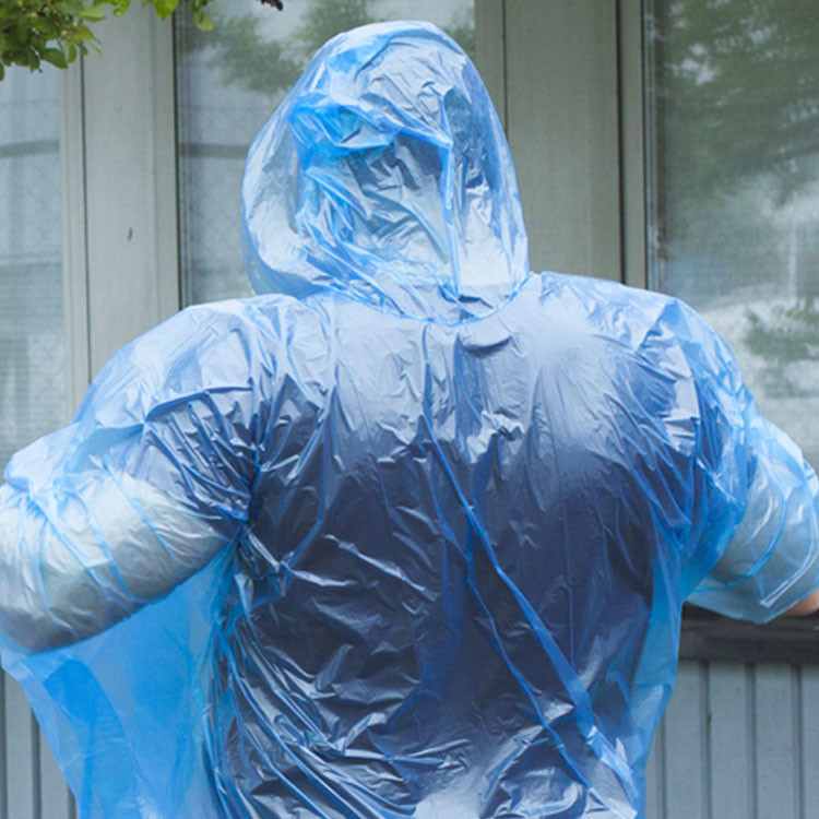 Regnponcho med huva för engångsbruk. Enkel och smidig att