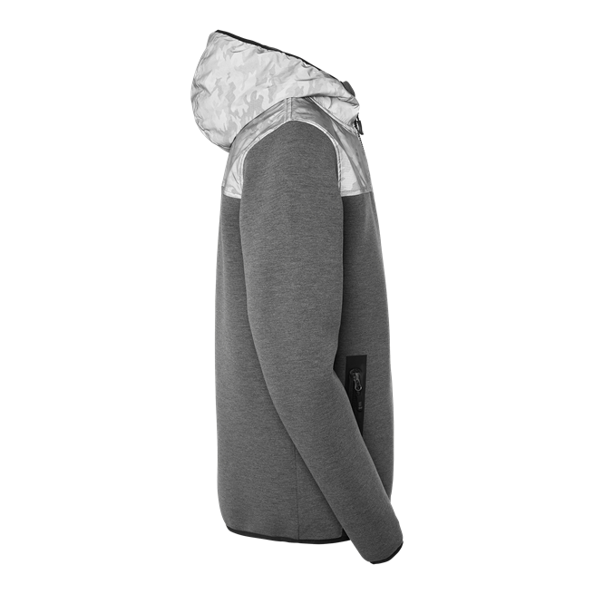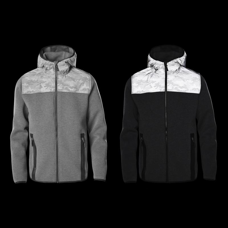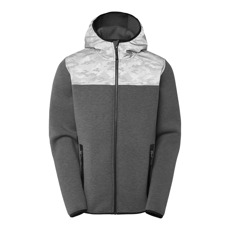 Jacka i Scuba-material med dubbelsidigt bondat tyg för skönare känsla. Reflekterande ton-i-ton-tyg i camouflage på axlar och huva. Elastiskt band i nederkant och ärmslut. Rymliga sidfickor med dragkedjor och tejpade detaljer.