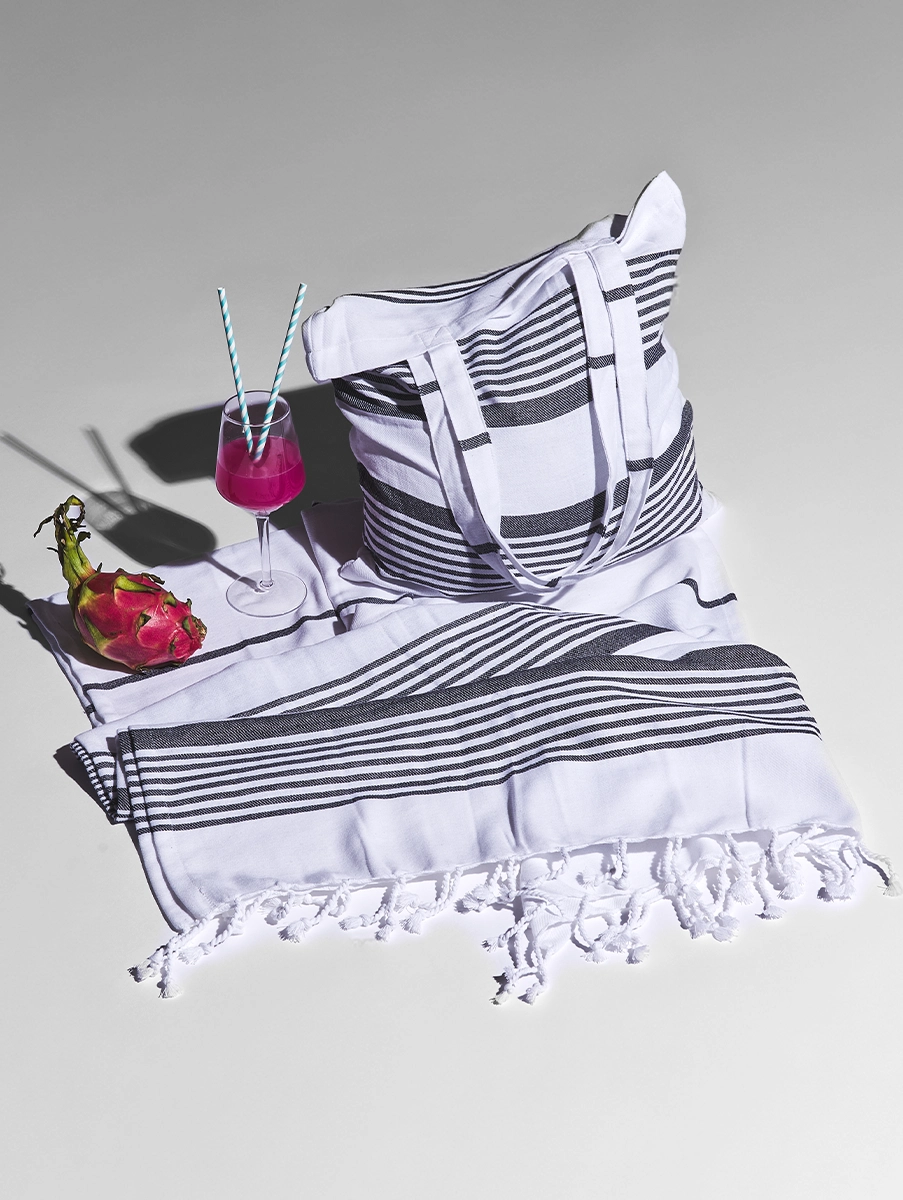 Denna hamamhandduk med matchande totebag kombinerar stil, funktion och hållbarhet i ett genomtänkt set. Tillverkad helt i återvunnet material är den ett medvetet val för dig som vill njuta av kvalitet – med omtanke om miljön.