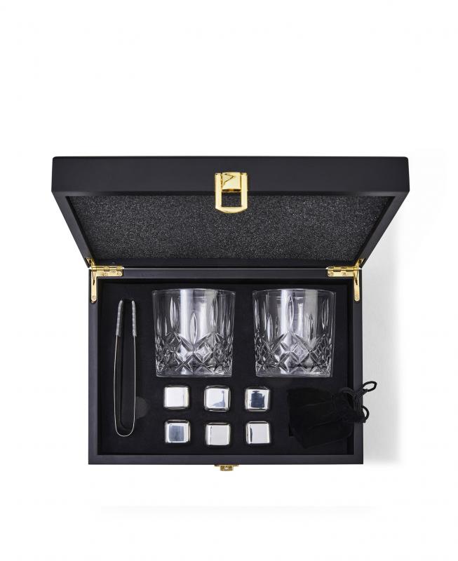 En komplett whiskeyset för dig som gillar det lite mer elaganta. Setet kommer i en svart träbox med silverdetaljer (fel färg på bilden) som blir en fin inredningsdetalj i ditt hem. Setet innehåller 2 whiskeyglas med härlig tyngd för att ligga stabilt i handen, whiskeystenar i rostfritt stål för att kyla whiskeyn, en tång till stenarna samt en påse i plysch för att förvara stenarna.